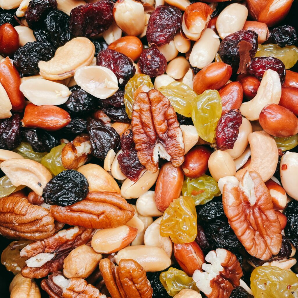 Een heerlijke mix van verschillende noten & vruchten : Pinda`s, vliespinda`s, cashewnoten, pecannoten, blauwe rozijnen, gele rozijnen en cranberry`s.