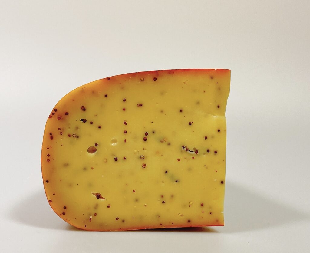 Zeker één van ons meest gewilde kazen in ons kruidenkaas assortiment is toch wel de mosterdkaas. Deze Goudse kaas is jong en romig van structuur maar door de toegevoegde mosterdzaden krijgt de kaas toch een lekker bite. De kaas is perfect voor het dagelijks gebruik voor op de boterham of cracker, maar de kaas is ook een zeer goede aanvulling voor op de borrelplank of voor uit het vuistje.